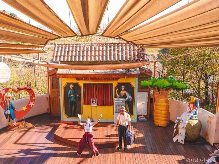 청평댐에서 남이섬 방향으로 호숫가 길을 따라 10km쯤 가다 보면 왼쪽 언덕에 이국적 건물들이 옹기종기 모여 있는 걸 볼 수 있다. 건물만 보면 지중해 연안의 마을 같기도 하고 호명산의 수려한 주위 배경과 함께 보면 마치 알프스 산록의 전원마을 같은 이곳은, 프랑스 문화마을 쁘띠프랑스이다. 쁘띠프랑스의 컨셉트는 ''꽃과 별, 그리고 어린왕자''이다. 쁘띠프랑스는 청소년수련시설(고성청소년수련원)을 겸한 프랑스 문화마을로, 가평군 청평면 고성리 일대에 조성됐다. 쁘띠프랑스는 프랑스풍 건물로 이루어져 있으며 관람객들은 숙박을 하면서 프랑스의 의식주 문화를 체험할 수 있다. 이밖에 쌩텍쥐페리의 일생과 어린왕자 등 작품세계를 설명한 쌩텍쥐페리 기념관, 200년 된 오르골에서 나오는 감미로운 선율을 들을 수 있는 오르골 하우스, 프랑스 고택을 그대로 들여와 지은 프랑스 전통주택 전시관, 프랑스의 상징인 ‘닭’ 조각과 그림, 자기를 비롯해 프랑스 및 유럽에서 수집한 골동품을 볼 수 있는 골동품 전시관 등에서도 독특한 프랑스 문화를 체험할 수 있다. 최대 200여 명 수용 가능한 4∼10인용 객실을 갖추고 있어 단체수련회나 MT 장소로도 좋은 곳이다. (자료출처 : 대한민국 구석구석 - korean.visitkorea.or.kr) 위치 : 펜션에서 차량으로 약 34분, 42km